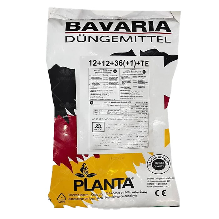 کود 36-12-12 باواریا یک کود کامل NPK سه‌گانه با فرمولاسیون متعادل ازت بالا (نیتروژن)، فسفر و پتاسیم است که برای تغذیه سریع گیاهان در مراحل رشد رویشی طراحی شده است. این کود محصولی از شرکت باواریا آلمان بوده و به‌صورت پودری و محلول‌پذیر در آب ارائه می‌شود